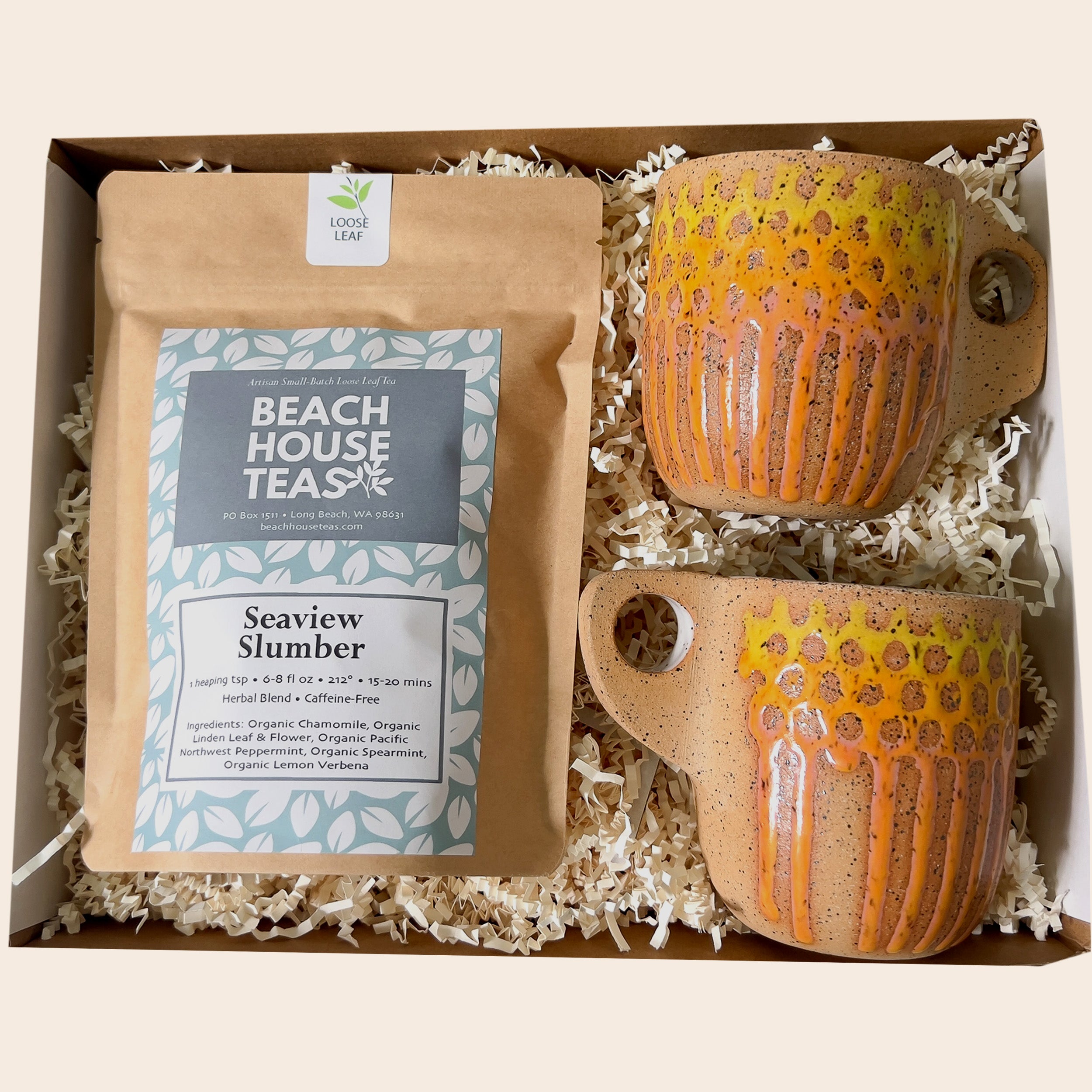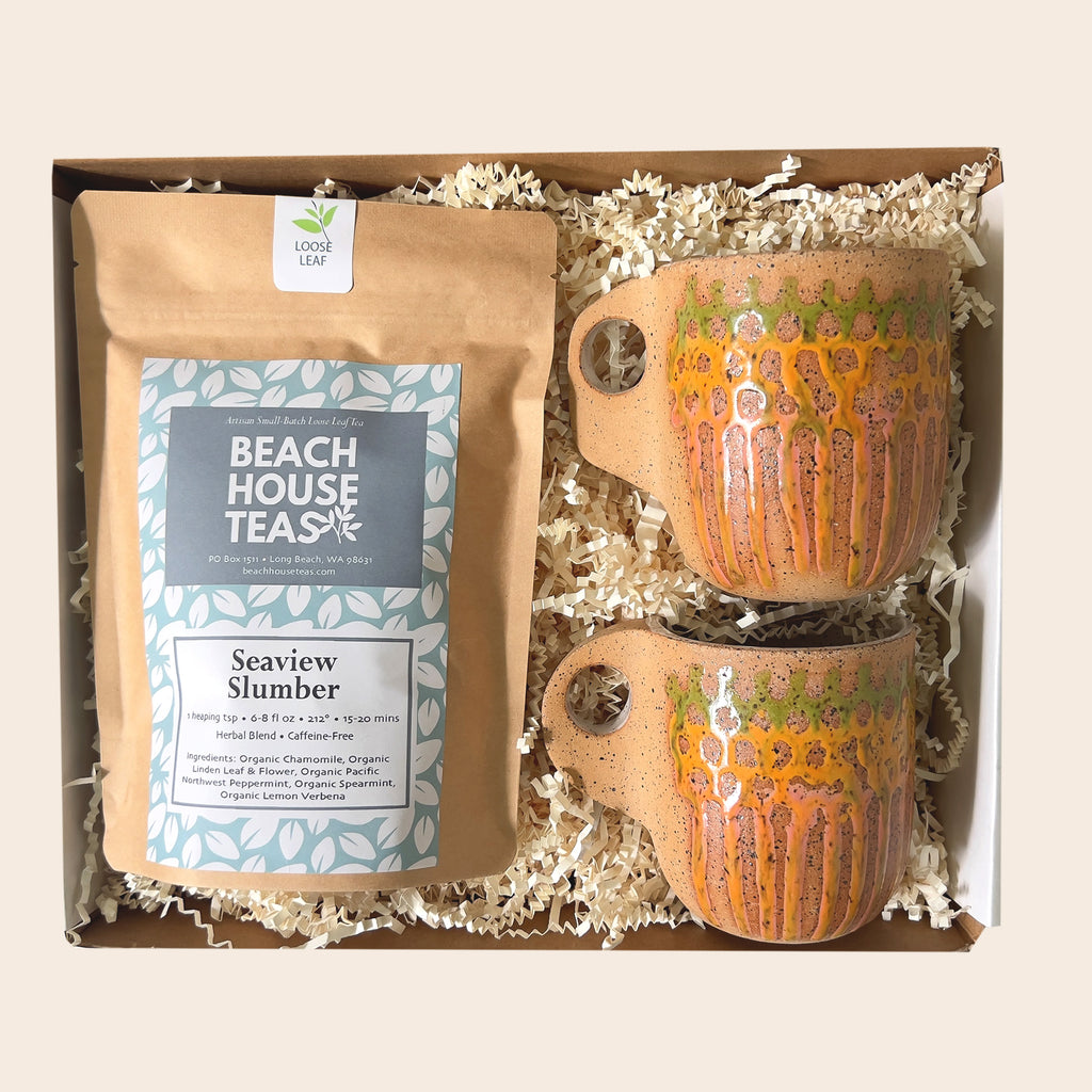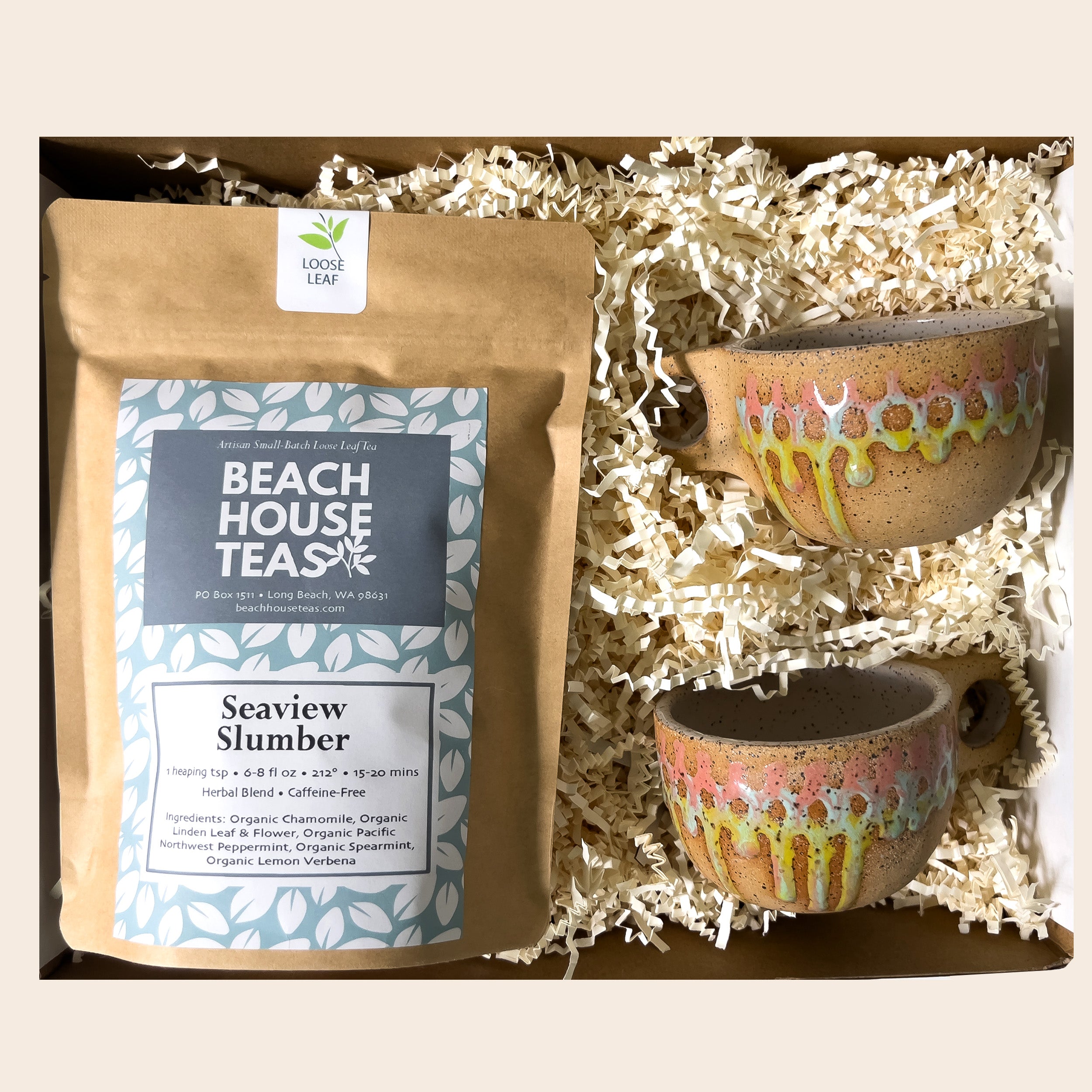 Share a nightly ritual of calm. This artisanal set features handblended Seaview Slumber loose-leaf tea—a soothing blend of chamomile and coastal herbs crafted to quiet the mind and ease you into restful sleep. Two handcrafted mugs make it a cozy moment to share. A perfect gift for slowing down together.